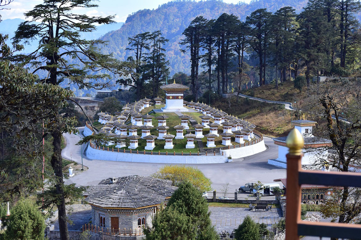 The Dochula Pass is a mountain pass in the snow-covered Himalayas within Bhutan on the road from Thimpu to Punakha where 108 memorial chortens or stupas known as “Druk Wangyal Chortens” have been built by Ashi Dorji Wangmo Wangchuk, the eldest Queen Mother. Apart from the chortens there is a monastery called the Druk Wangyal Lhakhang (temple), built in the honour of the fourth Druk Gyalpo (head of the state of Bhutan), Jigme Singye Wangchuck; the open grounds in its front yard is a venue for the annual Dochula Druk Wangyel Festival. The pass with 108 memorial chortens is adjacent to the country’s first Royal Botanical Park.